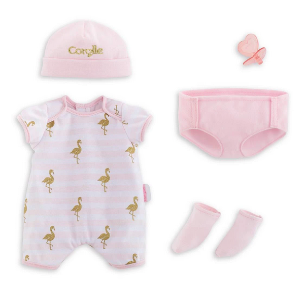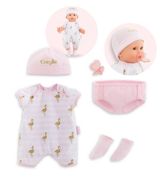 This newborn gift set is an essential for a 14-inch mon grand poupon Corolle baby doll! Included are a short-sleeved onesie and matching cap, a pair of socks, a cloth diaper and a pacifier. Featuring soft yet durable fabric and a self-adhesive closure the onesie is easy for small hands to manage!