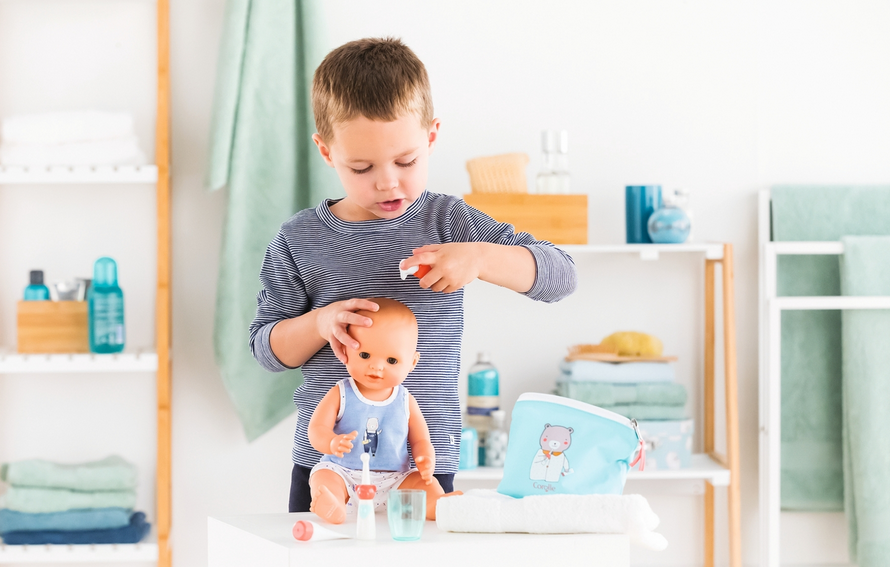 Little ones can play pretend by practicing grooming and hygiene on their 12, 14, or 17-inch Corolle dolls with Corolle's Baby Doll Care Pouch and Accessories. It includes lotion, toothbrush, toothpaste, and cup in a cute zippered pouch.